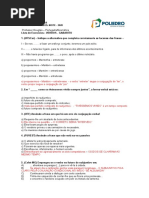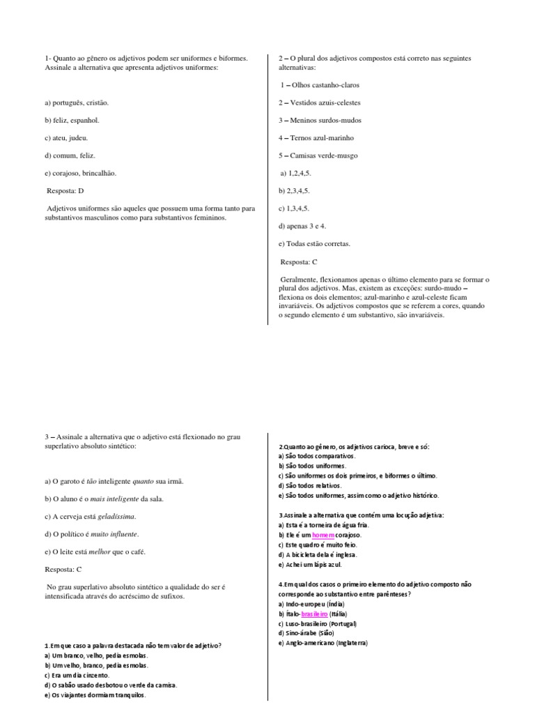 [Link] ao gnero, os adjetivos carioca, breve e s: a) So todos comparativos. b) So todos uniformes. c) So uniformes os dois primeiros, e biformes o ltimo. d) So todos relativos. e) So todos uniformes, assim como o adjetivo histrico. [Link] a alternativa que contm uma locuo adjetiva: a) Esta a torneira de gua fria. b) Ele um homem corajoso. c) Este quadro muito feio. d) A bicicleta dela inglesa. e) Achei um lpis azul. [Link] qual dos casos o primeiro elemento do adjetivo composto no corresponde ao substantivo entre parnteses? a) Indo-europeu (ndia) b) talo-brasileiro (Itlia) c) Luso-brasileiro (Portugal) d) Sino-rabe (Sio) e) Anglo-americano (Inglaterra)