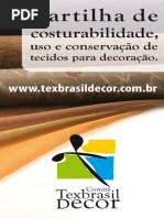 Cartilha de Costurabilidade, Uso e Conservao de Tecidos para Decorao - Segunda Edio, 2011, Comit de Tecidos para Decorao da ABIT (Associao Brasileira da Indstria Txtil e de Confeco) Elaborao: Maria Adelina Pereira Comisso executiva: Anselmo Lancman, Carlos Jorge Leito, Mirela Wiezel Coordenao geral: Ramiro Sanchez Palma Coordenao do projeto: Isabel Pires Projeto grfico: CNagai Business Consulting Diagramao, artes e produo grfica: Choice Comunicaes Reviso: Jornalista Elizabeth Florido - MTb 31.888 Foto da capa: Suely Haddad E-mail: contato@texbrasildecor.com.br www.texbrasildecor.com.br | Todos os direitos reservados. A reproduo total ou parcial s possvel mediante autorizao do respectivo Comit.