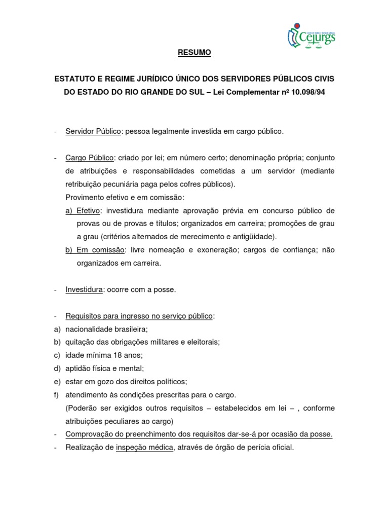 ESTATUTO E REGIME JURDICO NICO DOS SERVIDORES PBLICOS CIVIS DO ESTADO DO RIO GRANDE DO SUL Lei Complementar n 10.098/94