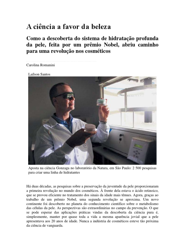 Como a descoberta do sistema de hidratao profunda da pele, feita por um prmio Nobel, abriu caminho para uma revoluo nos cosmticos