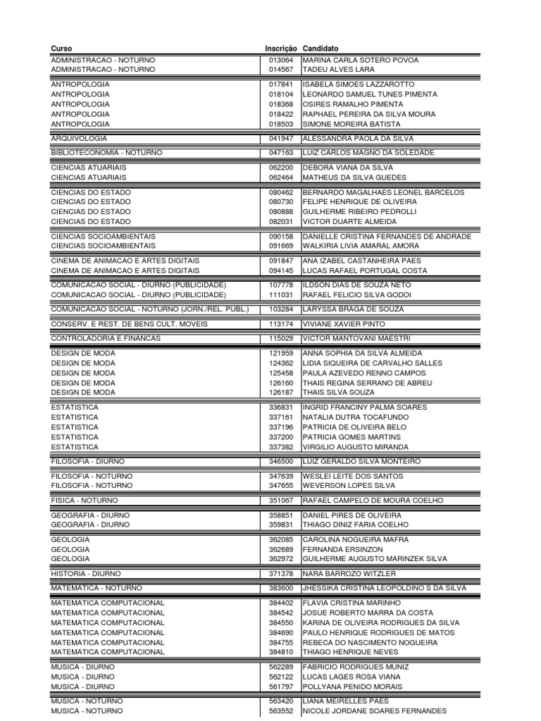 Inscrio Candidato 013064 014567 017841 018104 018368 018422 018503 041947 047163 062200 062464 080462 080730 080888 082031 090158 091669 091847 094145 107778 111031 103284 113174 115029 121959 124362 125458 126160 126187 336831 337161 337196 337200 337382 346500 347639 347655 351067 358851 359831 362085 362689 362972 371378 383600 384402 384542 384550 384690 384755 384810 562289 562122 561797 563420 563552 MARINA CARLA SOTERO POVOA TADEU ALVES LARA ISABELA SIMOES LAZZAROTTO LEONARDO SAMUEL TUNES PIMENTA OSIRES RAMALHO PIMENTA RAPHAEL PEREIRA DA SILVA MOURA SIMONE MOREIRA BATISTA ALESSANDRA PAOLA DA SILVA LUIZ CARLOS MAGNO DA SOLEDADE DEBORA VIANA DA SILVA MATHEUS DA SILVA GUEDES BERNARDO MAGALHAES LEONEL BARCELOS FELIPE HENRIQUE DE OLIVEIRA GUILHERME RIBEIRO PEDROLLI VICTOR DUARTE ALMEIDA DANIELLE CRISTINA FERNANDES DE ANDRADE WALKIRIA LIVIA AMARAL AMORA ANA IZABEL CASTANHEIRA PAES LUCAS RAFAEL PORTUGAL COSTA ILDSON DIAS DE SOUZA NETO RAFAEL FELICIO SILVA GODOI LARYSSA BRAGA DE SOUZA VIVIANE XAVIER PINTO VICTOR MANTOVANI MAESTRI ANNA SOPHIA DA SILVA ALMEIDA LIDIA SIQUEIRA DE CARVALHO SALLES PAULA AZEVEDO RENNO CAMPOS THAIS REGINA SERRANO DE ABREU THAIS SILVA SOUZA INGRID FRANCINY PALMA SOARES NATALIA DUTRA TOCAFUNDO PATRICIA DE OLIVEIRA BELO PATRICIA GOMES MARTINS VIRGILIO AUGUSTO MIRANDA LUIZ GERALDO SILVA MONTEIRO WESLEI LEITE DOS SANTOS WEVERSON LOPES SILVA RAFAEL CAMPELO DE MOURA COELHO DANIEL PIRES DE OLIVEIRA THIAGO DINIZ FARIA COELHO CAROLINA NOGUEIRA MAFRA FERNANDA ERSINZON GUILHERME AUGUSTO MARINZEK SILVA NARA BARROZO WITZLER JHESSIKA CRISTINA LEOPOLDINO S DA SILVA FLAVIA CRISTINA MARINHO JOSUE ROBERTO MARRA DA COSTA KARINA DE OLIVEIRA RODRIGUES DA SILVA PAULO HENRIQUE RODRIGUES DE MATOS REBECA DO NASCIMENTO NOGUEIRA THIAGO HENRIQUE NEVES FABRICIO RODRIGUES MUNIZ LUCAS LAGES ROSA VIANA POLLYANA PENIDO MORAIS LIANA MEIRELLES PAES NICOLE JORDANE SOARES FERNANDES