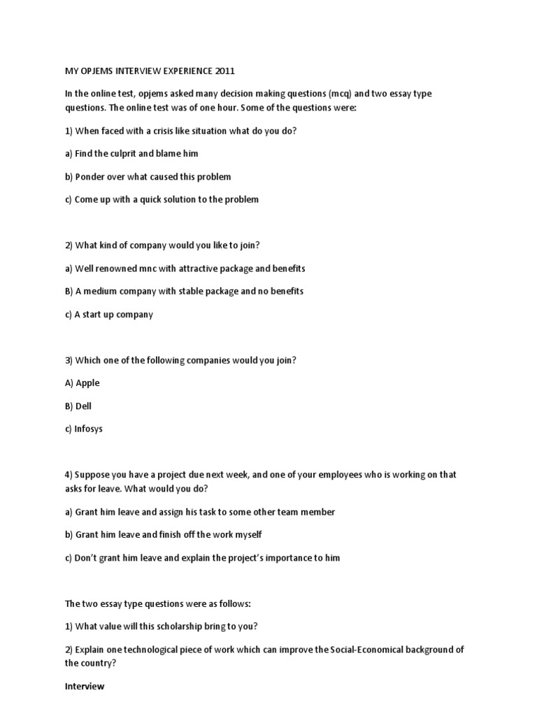 The two essay type questions were as follows: 1) What value will this scholarship bring to you? 2) Explain one technological piece of work which can improve the Social-Economical background of the country? Interview
