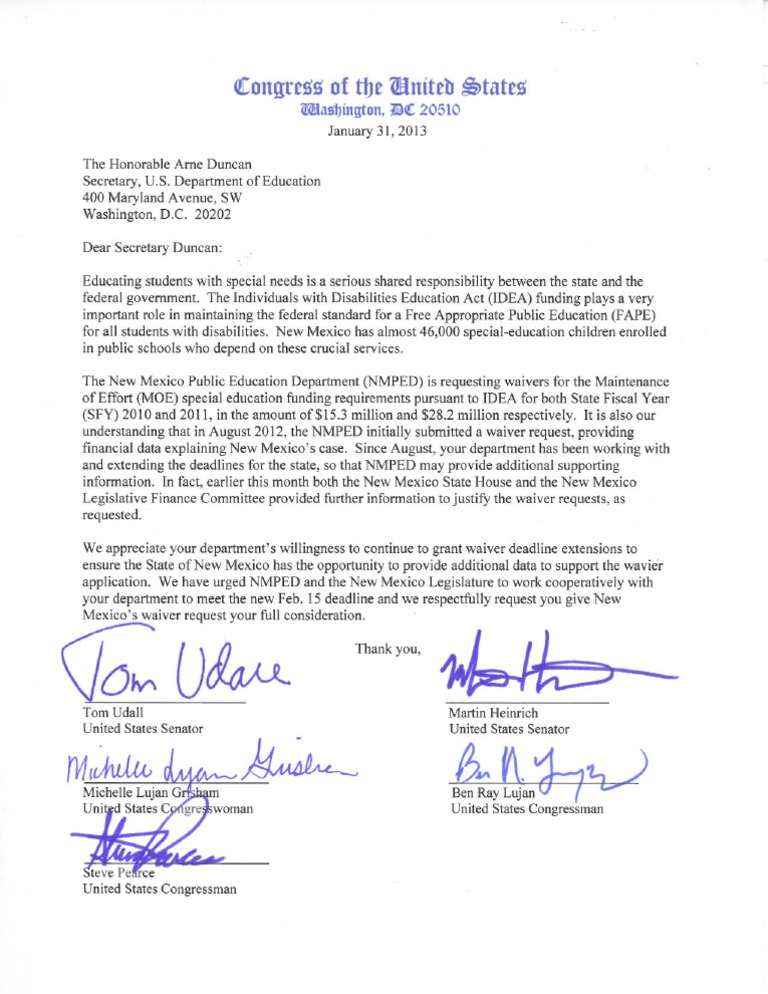 The New Mexico Congressional Delegation sent a letter to U.S. Department of Education regarding NMPED's waiver request for special education funding.