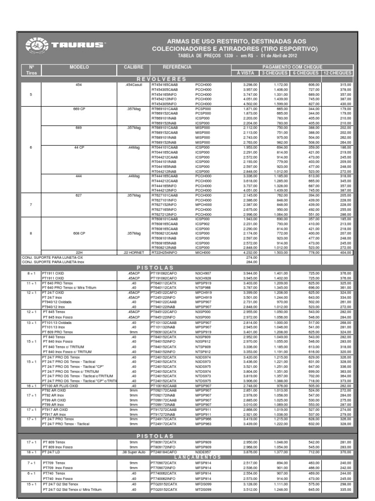 - A FORJAS TAURUS S/A. se reserva o direito de alterar os preos dessa tabela, SEM PRVIO AVISO.