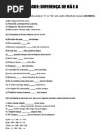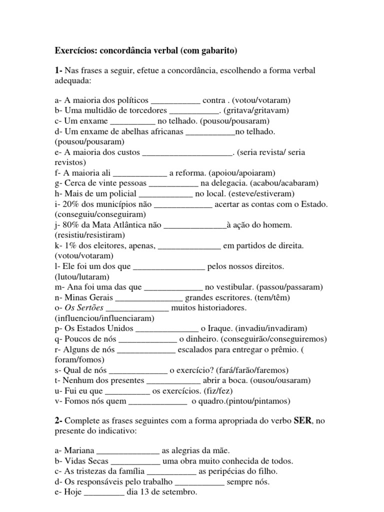 dos polticos ___________ contra . (votou/votaram) b- Uma multido de torcedores ___________. (gritava/gritavam) c- Um enxame __________ no telhado. (pousou/pousaram) d- Um enxame de abelhas africanas ___________no telhado. (pousou/pousaram) e- A maioria dos custos ____________________. (seria revista/ seria revistos) f- A maioria ali ____________ a reforma. (apoiou/apoiaram) g- Cerca de vinte pessoas ___________ na delegacia. (acabou/acabaram) h- Mais de um policial ____________ no local. (esteve/estiveram) i- 20% dos municpios no _____________ acertar as contas com o Estado. (conseguiu/conseguiram) j- 80% da Mata Atlntica no ______________ ao do homem. (resistiu/resistiram) k- 1% dos eleitores, apenas, ______________ em partidos de direita. (votou/votaram) l- Ele foi um dos que ________________ pelos nossos direitos. (lutou/lutaram) m- Ana foi uma das que _____________ no vestibular. (passou/passaram) n- Minas Gerais _______________ grandes escritores. (tem/tm) o- Os Sertes ______________ muitos historiadores. (influenciou/influenciaram) p- Os Estados Unidos ______________ o Iraque. (invadiu/invadiram) q- Poucos de ns _____________ o dinheiro. (conseguiro/conseguiremos) r- Alguns de ns _____________ escalados para entregar o prmio. ( foram/fomos) s- Qual de ns _____________ o exerccio? (far/faro/faremos) t- Nenhum dos presentes ____________ abrir a boca. (ousou/ousaram) u- Fui eu que __________ os exerccios. (fiz/fez) v- Fomos ns quem _____________ o quadro.(pintou/pintamos) 2- Complete as frases seguintes com a forma apropriada do verbo SER, no presente do indicativo: a- Mariana ______________ as alegrias da me. b- Vidas Secas ___________ uma obra muito conhecida de todos. c- As tristezas da famlia ___________ as peripcias do filho. d- Os responsveis pelo trabalho ___________ sempre ns. e- Hoje _________ dia 13 de setembro.