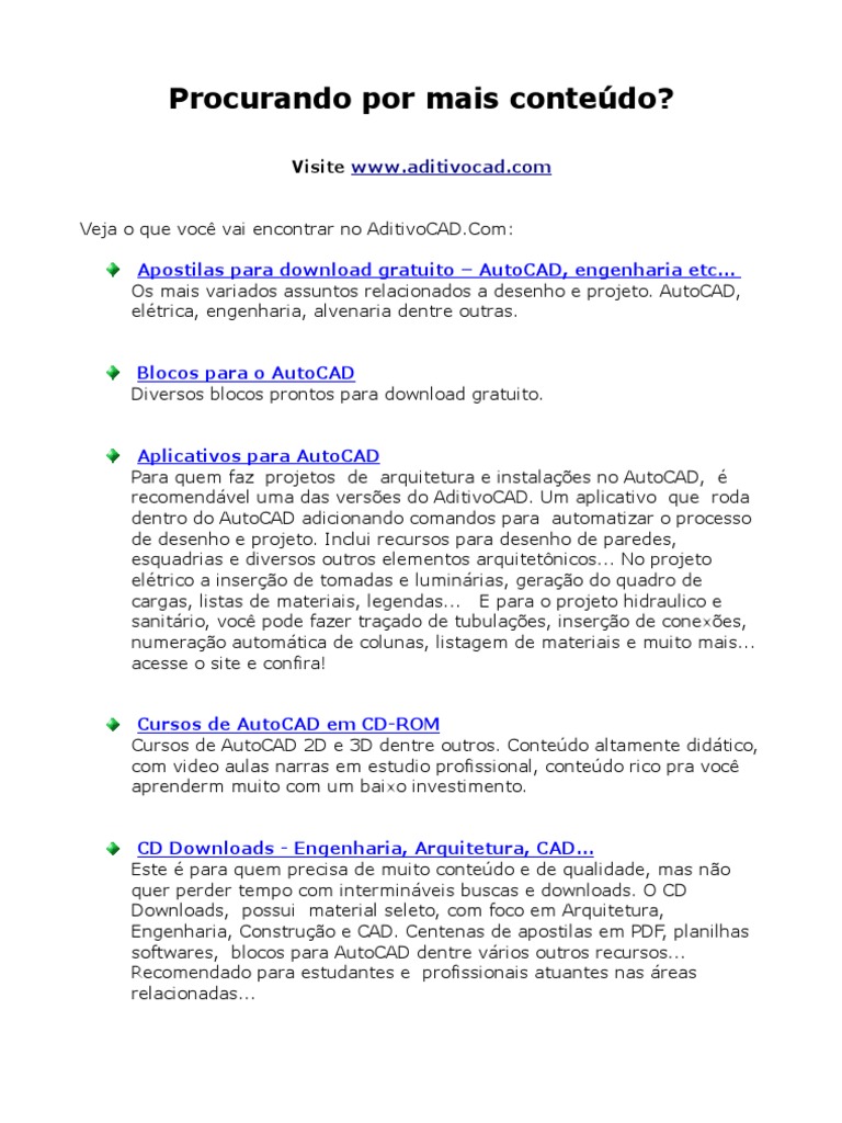 Visite www.aditivocad.com Veja o que voc vai encontrar no AditivoCAD.Com: Apostilas para download gratuito AutoCAD, engenharia etc... Os mais variados assuntos relacionados a desenho e projeto. AutoCAD, eltrica, engenharia, alvenaria dentre outras. Blocos para o AutoCAD Diversos blocos prontos para download gratuito. Aplicativos para AutoCAD Para quem faz projetos de arquitetura e instalaes no AutoCAD, recomendvel uma das verses do AditivoCAD. Um aplicativo que roda dentro do AutoCAD adicionando comandos para automatizar o processo de desenho e projeto. Inclui recursos para desenho de paredes, esquadrias e diversos outros elementos arquitetnicos... No projeto eltrico a insero de tomadas e luminrias, gerao do quadro de cargas, listas de materiais, legendas... E para o projeto hidraulico e sanitrio, voc pode fazer traado de tubulaes, insero de conexes, numerao automtica de colunas, listagem de materiais e muito mais... acesse o site e confira! Cursos de AutoCAD em CD-ROM Cursos de AutoCAD 2D e 3D dentre outros. Contedo altamente didtico, com video aulas narras em estudio profissional, contedo rico pra voc aprenderm muito com um baixo investimento. CD Downloads - Engenharia, Arquitetura, CAD... Este para quem precisa de muito contedo e de qualidade, mas no quer perder tempo com interminveis buscas e downloads. O CD Downloads, possui material seleto, com foco em Arquitetura, Engenharia, Construo e CAD. Centenas de apostilas em PDF, planilhas softwares, blocos para AutoCAD dentre vrios outros recursos... Recomendado para estudantes e profissionais atuantes nas reas relacionadas...