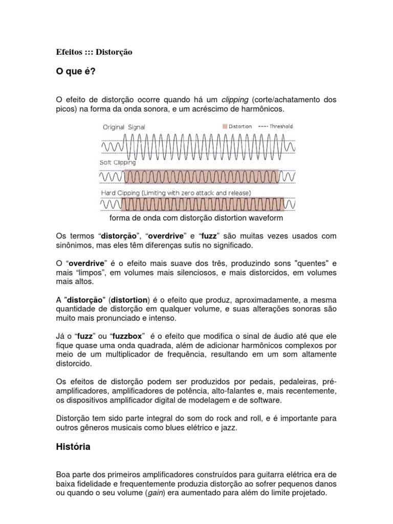 forma de onda com distoro distortion waveform Os termos distoro, overdrive e fuzz so muitas vezes usados com sinnimos, mas eles tm diferenas sutis no significado. O overdrive o efeito mais suave dos trs, produzindo sons "quentes" e mais limpos, em volumes mais silenciosos, e mais distorcidos, em volumes mais altos. A "distoro" (distortion) o efeito que produz, aproximadamente, a mesma quantidade de distoro em qualquer volume, e suas alteraes sonoras so muito mais pronunciado e intenso. J o fuzz ou fuzzbox o efeito que modifica o sinal de udio at que ele fique quase uma onda quadrada, alm de adicionar harmnicos complexos por meio de um multiplicador de frequncia, resultando em um som altamente distorcido. Os efeitos de distoro podem ser produzidos por pedais, pedaleiras, pramplificadores, amplificadores de potncia, alto-falantes e, mais recentemente, os dispositivos amplificador digital de modelagem e de software. Distoro tem sido parte integral do som do rock and roll, e importante para outros gneros musicais como blues eltrico e jazz.