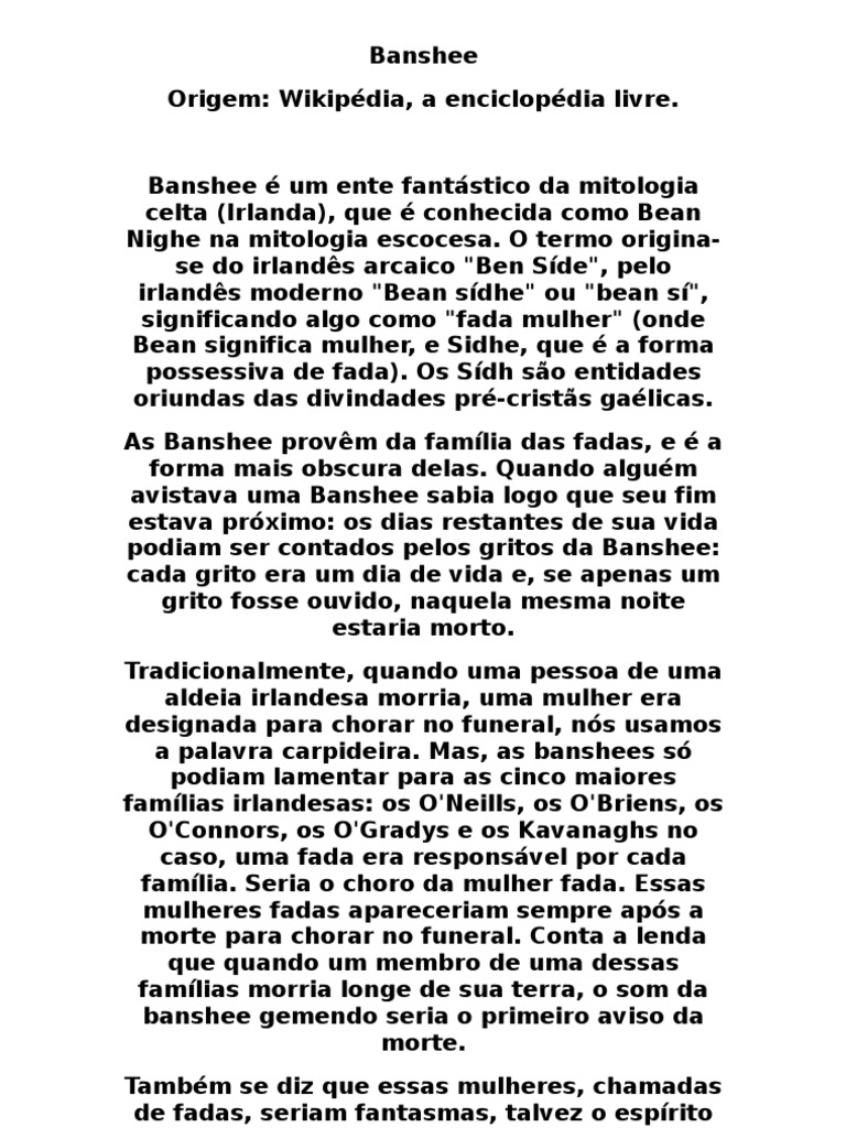 que morreu ao nascer. Na Irlanda se acredita que aqueles que possuem o dom da musica e do canto, so protegidos pelos espritos; um, o Esprito da Vida, que profecia, cujas pessoas so chamadas fey e tm o dom da Viso; o outro, o Esprito da Maldio que revela os segredos da m sorte e da morte, e para essa trgica mensageira o nome Banshee. Sejam quais forem suas origens, as banshees aparecem principalmente sob um dos trs disfarces: uma jovem, uma senhora ou uma pessoa esfarrapada. Isso representa o aspecto trplice da deusa Celta da guerra e da morte, chamada Badhbh, Macha and Mor-Rioghain. Ela normalmente usa uma capa com capuz cinza, ou uma roupa esvoaante ou uma mortalha. Ela tambm pode surgir como uma lavadeira, e vista lavando roupas sujas de sangue daqueles que iro morrer. Nesse disfarce ela conhecida como bean-nighe (a lavadeira). Segundo a mitologia celta, tambm pode aparecer em forma de uma jovem e bela mulher, ou mesmo de uma velha repugnante. Qualquer que seja a forma, porm, sua face sempre muito plida como a morte, e seus cabelos por vezes so negros como a noite ou ruivos como o sol. O gemido da Banshee um som especialmente triste que parece o som melanclico do uivo do vento e tem o tom da voz humana alm de ser audvel a grande distncia. Embora nem sempre seja vista, seu gemido ouvido, usualmente a noite quando algum est prestes a morrer. Em 1437, se aproximou do rei James I da Esccia, uma vidente ou banshee que profetizou o assassinato do rei por instigao do Conde de Atholl. Esse um exemplo de banshee em forma humana.