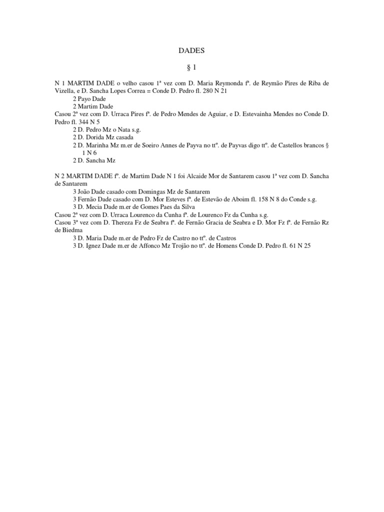 N 1 MARTIM DADE o velho casou 1 vez com D. Maria Reymonda f. de Reymo Pires de Riba de Vizella, e D. Sancha Lopes Correa = Conde D. Pedro fl. 280 N 21 2 Payo Dade 2 Martim Dade Casou 2 vez com D. Urraca Pires f. de Pedro Mendes de Aguiar, e D. Estevainha Mendes no Conde D. Pedro fl. 344 N 5 2 D. Pedro Mz o Nata s.g. 2 D. Dorida Mz casada 2 D. Marinha Mz m.er de Soeiro Annes de Payva no tt. de Payvas digo tt. de Castellos brancos 1N6 2 D. Sancha Mz N 2 MARTIM DADE f. de Martim Dade N 1 foi Alcaide Mor de Santarem casou 1 vez com D. Sancha de Santarem 3 Joo Dade casado com Domingas Mz de Santarem 3 Ferno Dade casado com D. Mor Esteves f. de Estevo de Aboim fl. 158 N 8 do Conde s.g. 3 D. Mecia Dade m.er de Gomes Paes da Silva Casou 2 vez com D. Urraca Lourenco da Cunha f. de Lourenco Fz da Cunha s.g. Casou 3 vez com D. Thereza Fz de Seabra f. de Ferno Gracia de Seabra e D. Mor Fz f. de Ferno Rz de Biedma 3 D. Maria Dade m.er de Pedro Fz de Castro no tt. de Castros 3 D. Ignez Dade m.er de Affonco Mz Trojo no tt. de Homens Conde D. Pedro fl. 61 N 25