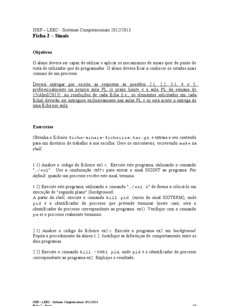 Objetivos O aluno dever ser capaz de utilizar e aplicar os mecanismos de sinais quer do ponto de vista de utilizador que de programador. O aluno dever ficar a conhecer os estados mais comuns de um processo. Dever entregar por escrito as respostas s questes 2.1, 2.2, 3.1, 4 e 5, preferencialmente na prpria aula PL (o prazo limite a aula PL da semana de 15/Abril/2013). As resolues de cada ficha (i.e., os elementos solicitados em cada ficha) devero ser entregues exclusivamente nas aulas PL e s ser aceite a entrega de uma ficha por aula.