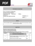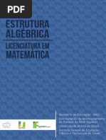 Conjuntos com operaes que satisfazem axiomas determinados previamente so chamados de estruturas algbricas. Anel uma estrutura algbrica. As estruturas algbricas chamadas anel comutativo, anel com unidade, domnio de integridade e corpo , so anis que satisfazem outros axiomas especficos alm dos seis axiomas de anel. Neste curso apresentaremos tambm a estrutura algbrica chamada grupo. Um grupo uma estrutura algbrica com uma operao, que satisfaz trs axiomas. Os grupos foram introduzidos por Evarist Galois (1811-1832) e, historicamente, esto associados aos anis de polinmios e resoluo de equaes polinomiais por meio de radicais. O objetivo deste guia orientar os estudos dos alunos do Curso de Especializao na disciplina de lgebra. O guia de estudos est dividido da forma seguinte: Plano de Ensino: Ementa Objetivos Gerais Objetivos Especficos Contedo Programtico Metodologia Avaliao Referncias Bibliogrficas Cronograma de Atividades: Identificao da semana Contedo para o perodo Data da videoconferncia Principais temas da videoconferncia Atividades de estudos para o perodo Exerccios recomendados; Observaes e sugestes. Para desenvolver o programa da disciplina de lgebra, usaremos os livros abaixo: Domingues, H. H. lgebra Moderna, 4 edio reformulada, Atual Editora, So Paulo, 2003. Gonalves, A. Introduo lgebra, 5 edio, Projeto Euclides IMPA, Rio de Janeiro, 2008.