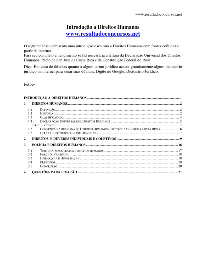 O seguinte texto apresenta uma introduo e resumo a Direitos Humanos com fontes colhidas a partir da internet. Para seu completo entendimento se faz necessria a leitura da Declarao Universal dos Direitos Humanos, Pacto de San Jos da Costa Rica e da Constituio Federal de 1988. Dica: Em caso de dvidas quanto a algum termo jurdico acesse gratuitamente algum dicionrio jurdico na internet para sanar suas dvidas. Digite no Google: Dicionrio Jurdico. ndice: