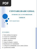 Contabilidade a cincia que estuda, registra, controla e interpreta os fatos ocorridos no patrimnio das entidades com fins lucrativos ou no. 1.2 CAMPO DE APLICAO O das entidades econmico-administrativas, sejam de fins lucrativos ou no. 1.3 OBJETO DE ESTUDO DA CONTABILIDADE O patrimnio das entidades. 1.4 PATRIMNIO Conjunto de bens, direitos e obrigaes vinculados entidade econmico administrativa. 1.5 FINALIDADES DA CONTABILIDADE
