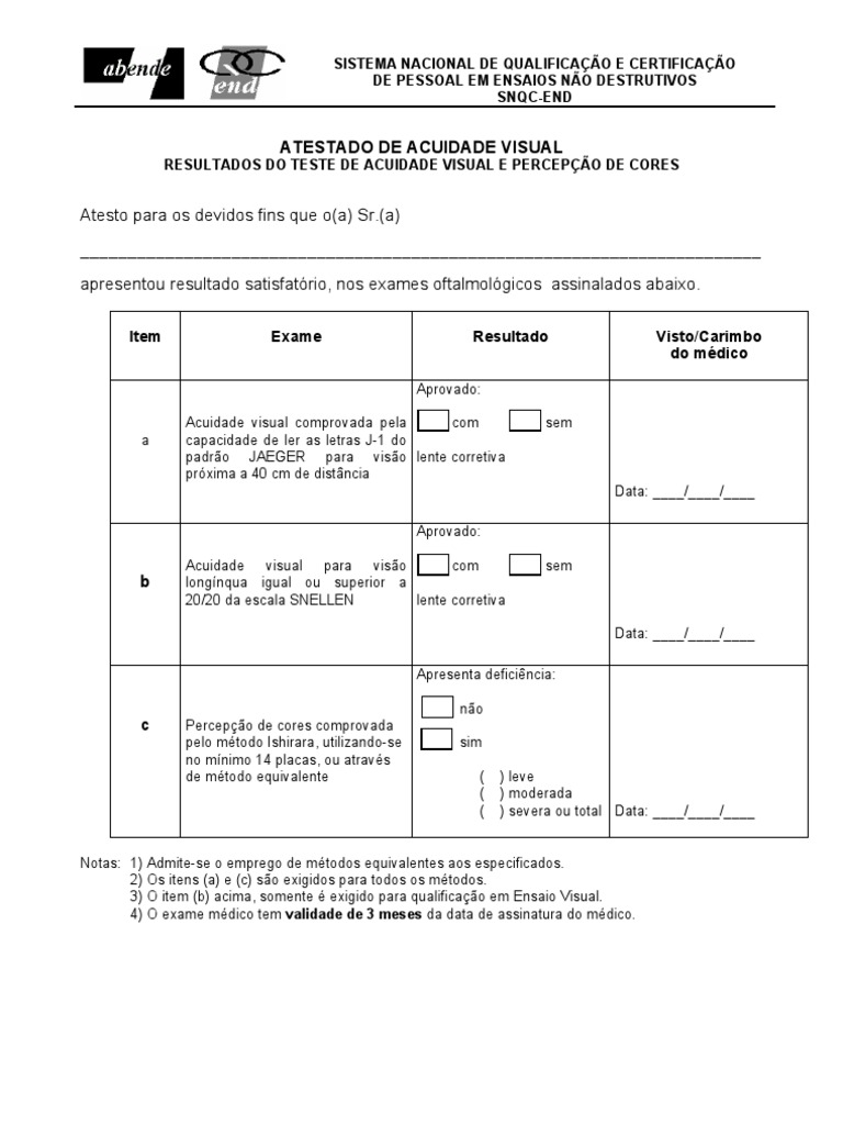 Notas: 1) Admite-se o emprego de mtodos equivalentes aos especificados. 2) Os itens (a) e (c) so exigidos para todos os mtodos. 3) O item (b) acima, somente exigido para qualificao em Ensaio Visual. 4) O exame mdico tem validade de 3 meses da data de assinatura do mdico.