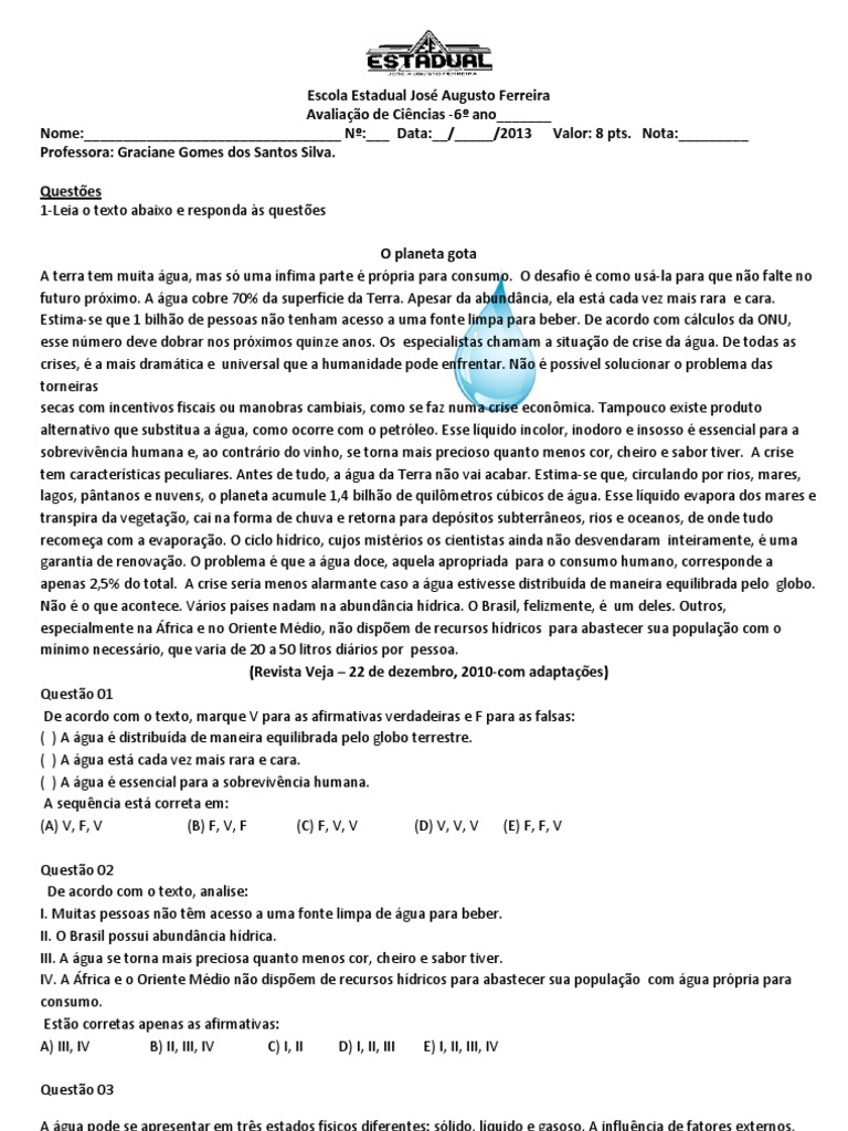 Nota:_________ Professora: Graciane Gomes dos Santos Silva. Questes 1-Leia o texto abaixo e responda s questes O planeta gota A terra tem muita gua, mas s uma nfima parte prpria para consumo. O desafio como us-la para que no falte no futuro prximo. A gua cobre 70% da superfcie da Terra. Apesar da abundncia, ela est cada vez mais rara e cara. Estima-se que 1 bilho de pessoas no tenham acesso a uma fonte limpa para beber. De acordo com clculos da ONU, esse nmero deve dobrar nos prximos quinze anos. Os especialistas chamam a situao de crise da gua. De todas as crises, a mais dramtica e universal que a humanidade pode enfrentar. No possvel solucionar o problema das torneiras secas com incentivos fiscais ou manobras cambiais, como se faz numa crise econmica. Tampouco existe produto alternativo que substitua a gua, como ocorre com o petrleo. Esse lquido incolor, inodoro e insosso essencial para a sobrevivncia humana e, ao contrrio do vinho, se torna mais precioso quanto menos cor, cheiro e sabor tiver. A crise tem caractersticas peculiares. Antes de tudo, a gua da Terra no vai acabar. Estima-se que, circulando por rios, mares, lagos, pntanos e nuvens, o planeta acumule 1,4 bilho de quilmetros cbicos de gua. Esse lquido evapora dos mares e transpira da vegetao, cai na forma de chuva e retorna para depsitos subterrneos, rios e oceanos, de onde tudo recomea com a evaporao. O ciclo hdrico, cujos mistrios os cientistas ainda no desvendaram inteiramente, uma garantia de renovao. O problema que a gua doce, aquela apropriada para o consumo humano, corresponde a apenas 2,5% do total. A crise seria menos alarmante caso a gua estivesse distribuda de maneira equilibrada pelo globo. No o que acontece. Vrios pases nadam na abundncia hdrica. O Brasil, felizmente, um deles. Outros, especialmente na frica e no Oriente Mdio, no dispem de recursos hdricos para abastecer sua populao com o mnimo necessrio, que varia de 20 a 50 litros dirios por pessoa. (Revista Veja 22 de dezembro, 2010-com adaptaes) Questo 01 De acordo com o texto, marque V para as afirmativas verdadeiras e F para as falsas: ( ) A gua distribuda de maneira equilibrada pelo globo terrestre. ( ) A gua est cada vez mais rara e cara. ( ) A gua essencial para a sobrevivncia humana. A sequncia est correta em: (A) V, F, V (B) F, V, F (C) F, V, V (D) V, V, V (E) F, F, V Questo 02 De acordo com o texto, analise: I. Muitas pessoas no tm acesso a uma fonte limpa de gua para beber. II. O Brasil possui abundncia hdrica. III. A gua se torna mais preciosa quanto menos cor, cheiro e sabor tiver. IV. A frica e o Oriente Mdio no dispem de recursos hdricos para abastecer sua populao com gua prpria para consumo. Esto corretas apenas as afirmativas: A) III, IV B) II, III, IV C) I, II D) I, II, III E) I, II, III, IV Questo 03 A gua pode se apresentar em trs estados fsicos diferentes: slido, lquido e gasoso. A influncia de fatores externos, como a temperatura e a presso, faz com que a gua se apresente ora em um, ora em outro estado fsico, sendo que a