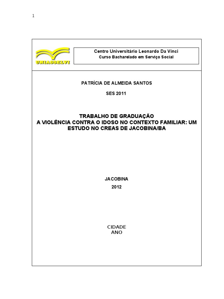 TRABALHO DE GRADUAO A VIOLNCIA CONTRA O IDOSO NO CONTEXTO FAMILIAR: UM ESTUDO NO CREAS DE JACOBINA/BA