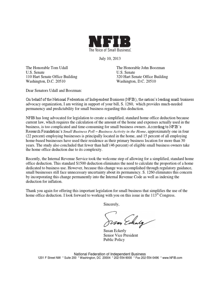 National Federation of Independent Businesses (NFIB) letter of support on S. 1260, Sens. Tom Udall & John Boozman's Helping Our Middle-Class Entrepreneurs (HOME) Act.