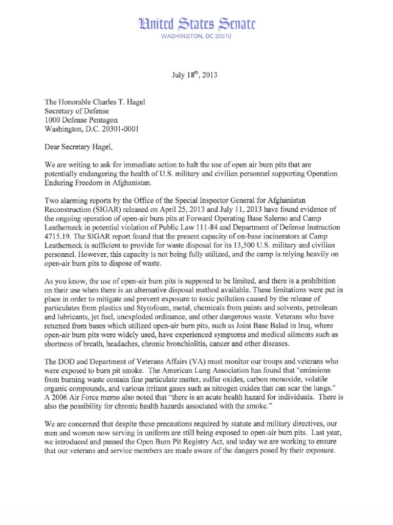 Letter to Secretary Hagel on Burn Pits in Afghanistan and SIGAR Report