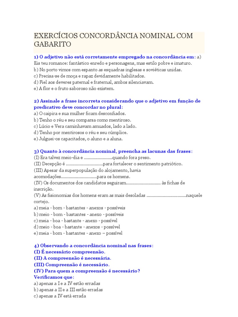 EXERCCIOS CONCORDNCIA NOMINAL COM GABARITO