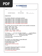 d) apenas a II est certa e) todas esto certas 5) Quanto ............................. interferncias ................................ , melhor .............................a) menas, existirem, sero b) menas, existirem, ser c) menas, existir, ser d) menos, existir, sero e) menos, existirem, ser 6) Qual alternativa preenche as lacunas abaixo corretamente? Segue _____ uma cpia do soneto composto pela ______ -poetisa, no qual a autora tenta imitar o grande Bilac, usando as ______ imagens. a) anexo, pseudo, mesmas b) anexa, pseuda, mesmas c) anexa, pseudo, mesma d) anexa, pseudo, mesmas e) anexo, pseuda, mesmas 7) (Uelondrina 1997) - Assinale a letra correspondente alternativa que preenche corretamente as lacunas da frase apresentada. As delegaes .......... que .......... participar dos jogos chegaro amanh. a) latinas-americanas - vem b) latinas-americanas - vem c) latinoamericanas - vm d) latinos-americanas - vm e) latinos-americanas vem 8) (Ita 1997) - Assinale a opo que completa corretamente as lacunas do texto a seguir: "Todas as amigas estavam _______________ ansiosas _______________ ler os jornais, pois foram informadas de que as crticas foram ______________ indulgentes ______________ rapaz, o qual, embora tivesse mais aptido _______________ cincias exatas, demonstrava uma certa propenso _______________ arte." a) meio - para - bastante - para com o - para - para a b) muito - em - bastante - com o - nas - em c) bastante - por - meias - ao - a - d) meias - para - muito - pelo - em - por e) bem - por - meio - para o - pelas na 9) (Mackenzie) I - No te molestaram, portanto cale a boca. II - Foi encontrado h seis anos atrs. III - Vimos, agora, trazer-lhe nosso apoio. IV - Os homens de bem, nada reclamaram. V - Permitiu-se a alguns luxos. Quanto correo gramatical das frases anteriores, afirma-se que: