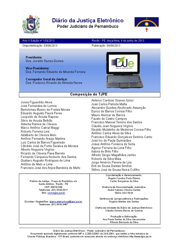 Dirio da Justia Eletrnico - Poder Judicirio de Pernambuco. Documento assinado digitalmente conforme MP n. 2.200-2/2001 de 24.8.2001, que institui a Infra-estrutura de Chaves Pblicas Brasileira - ICP-Brasil, podendo ser acessado atravs do endereo eletrnico http://www.tjpe.jus.br