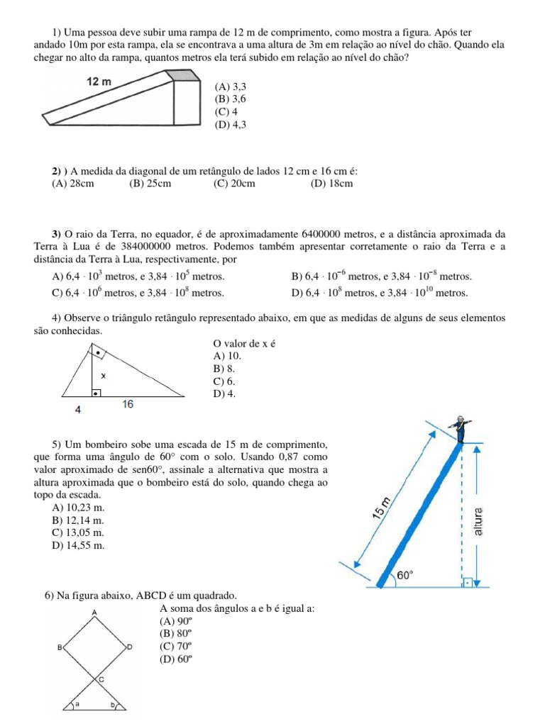5) Um bombeiro sobe uma escada de 15 m de comprimento, que forma uma ngulo de 60 com o solo. Usando 0,87 como valor aproximado de sen60, assinale a alternativa que mostra a altura aproximada que o bombeiro est do solo, quando chega ao topo da escada. A) 10,23 m. B) 12,14 m. C) 13,05 m. D) 14,55 m.