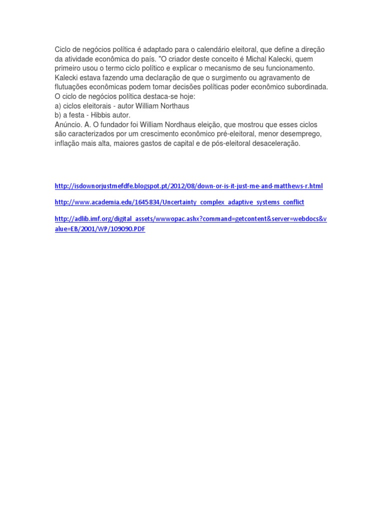 . "O criador deste conceito Michal Kalecki, quem primeiro usou o termo ciclo poltico e explicar o mecanismo de seu funcionamento. Kalecki estava fazendo uma declarao de que o surgimento ou agravamento de flutuaes econmicas podem tomar decises polticas poder econmico subordinada. O ciclo de negcios poltica destaca-se hoje: a) ciclos eleitorais - autor William Northaus b) a festa - Hibbis autor. Anncio. A. O fundador foi William Nordhaus eleio, que mostrou que esses ciclos so caracterizados por um crescimento econmico pr-eleitoral, menor desemprego, inflao mais alta, maiores gastos de capital e de ps-eleitoral desacelerao.