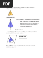a) Qual a medida do raio da "base" desse cone? b) Qual o volume do cone tendo essa base e a superfcie lateral descrita anteriormente? 17. (Fatec) A altura de um cone circular reto mede o triplo da medida do raio da base. Se o comprimento da circunferncia dessa base 8cm, ento o volume do cone, em centmetros cbicos, a) 64 b) 48 c) 32 d) 16 e) 8 18. (Uel) Um cone circular reto tem altura de 8cm e raio da base medindo 6cm. Qual , em centmetros quadrados, sua rea lateral? a) 20 b) 30 c) 40 d) 50 e) 60