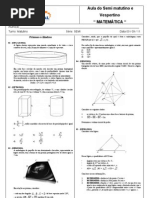 a) Sabendo que R = (3/2) r, determine o volume da gua no cilindro e o volume da substncia qumica no cone, em funo de r. (Para facilitar os clculos, use a aproximao = 3.) b) A substncia qumica do cone despejada no cilindro, formando uma mistura homognea (figura 3). Determine a concentrao (porcentagem) da substncia qumica na mistura e a altura h atingida pela mistura no cilindro. 9. (Fuvest) Deseja-se construir um cone circular reto com 4cm de raio da base e 3cm de altura. Para isso, recorta-se, em cartolina, um setor circular para a superfcie lateral e um crculo para a base. A medida do ngulo central do setor circular : a) 144 b) 192 c) 240 d) 288 e) 336 10. (Fuvest) Um pedao de cartolina possui a forma de um semi-crculo de raio 20cm. Com essa cartolina um menino constri um chapu cnico e o coloca com a base apoiada sobre uma mesa. Qual a distncia do bico do chapu mesa? a) 103 cm. b) 310 cm. c) 202 cm. d) 20 cm. e) 10 cm. 11. (Fuvest) Considere um tringulo retngulo com hipotenusa A e catetos B e C. Sejam V, V, V os volumes dos slidos gerados pela rotao do tringulo em torno dos lados A, B e C, respectivamente. a) Calcule V, V, V em funo das medidas de A, B e C. b) Escreva a V em funo de B, C, V e V.