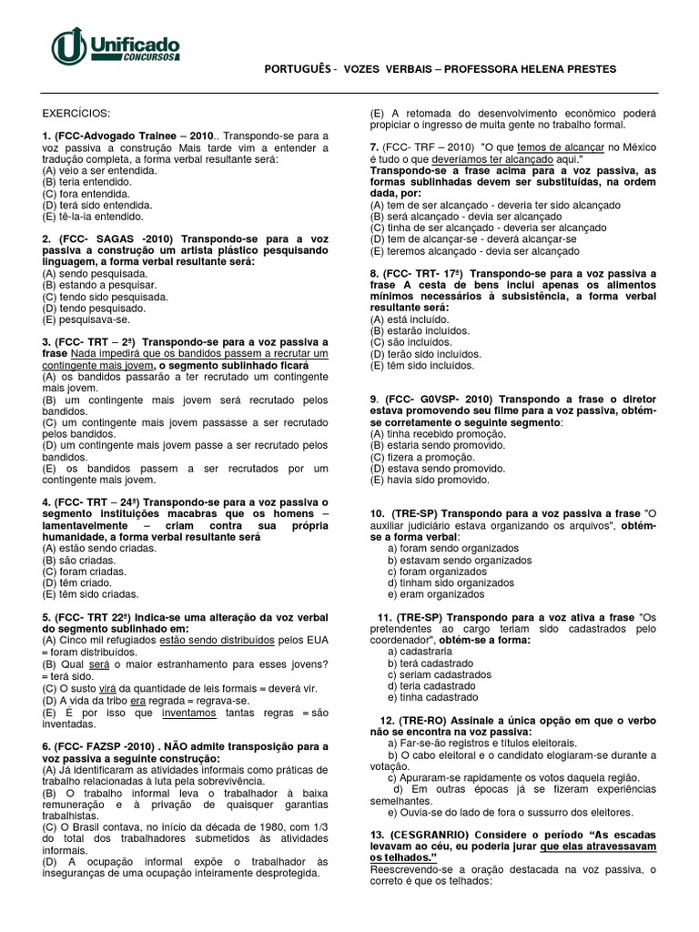 EXERCCIOS: 1. (FCC-Advogado Trainee 2010.. Transpondo-se para a voz passiva a construo Mais tarde vim a entender a traduo completa, a forma verbal resultante ser: (A) veio a ser entendida. (B) teria entendido. (C) fora entendida. (D) ter sido entendida. (E) t-la-ia entendido. 2. (FCC- SAGAS -2010) Transpondo-se para a voz passiva a construo um artista plstico pesquisando linguagem, a forma verbal resultante ser: (A) sendo pesquisada. (B) estando a pesquisar. (C) tendo sido pesquisada. (D) tendo pesquisado. (E) pesquisava-se. 3. (FCC- TRT 2) Transpondo-se para a voz passiva a frase Nada impedir que os bandidos passem a recrutar um contingente mais jovem, o segmento sublinhado ficar (A) os bandidos passaro a ter recrutado um contingente mais jovem. (B) um contingente mais jovem ser recrutado pelos bandidos. (C) um contingente mais jovem passasse a ser recrutado pelos bandidos. (D) um contingente mais jovem passe a ser recrutado pelos bandidos. (E) os bandidos passem a ser recrutados por um contingente mais jovem. 4. (FCC- TRT 24) Transpondo-se para a voz passiva o segmento instituies macabras que os homens lamentavelmente criam contra sua prpria humanidade, a forma verbal resultante ser (A) esto sendo criadas. (B) so criadas. (C) foram criadas. (D) tm criado. (E) tm sido criadas. 5. (FCC- TRT 22) Indica-se uma alterao da voz verbal do segmento sublinhado em: (A) Cinco mil refugiados esto sendo distribudos pelos EUA foram distribudos. (B) Qual ser o maior estranhamento para esses jovens? ter sido. (C) O susto vir da quantidade de leis formais dever vir. (D) A vida da tribo era regrada regrava-se. (E) por isso que inventamos tantas regras so inventadas. 6. (FCC- FAZSP -2010) . NO admite transposio para a voz passiva a seguinte construo: (A) J identificaram as atividades informais como prticas de trabalho relacionadas luta pela sobrevivncia. (B) O trabalho informal leva o trabalhador baixa remunerao e privao de quaisquer garantias trabalhistas. (C) O Brasil contava, no incio da dcada de 1980, com 1/3 do total dos trabalhadores submetidos s atividades informais. (D) A ocupao informal expe o trabalhador s inseguranas de uma ocupao inteiramente desprotegida.