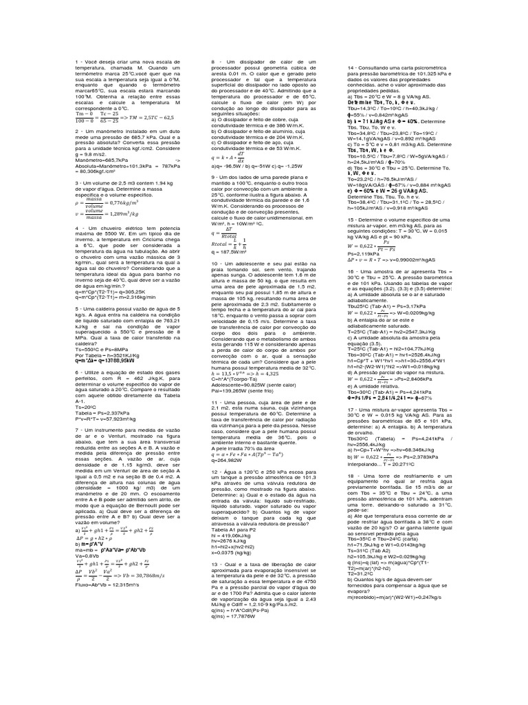 2 - Um manmetro instalado em um duto mede uma presso de 685,7 kPa. Qual e a presso absoluta? Converta essa presso para a unidade tcnica kgf./cm2. Considere g = 9,8 m/s2. Manmetro=685,7kPa -> Absoluta=Manmetro+101,3kPa = 787kPa = 80,306kgf./cm 3 - Um volume de 2,5 m3 contem 1,94 kg de vapor d'gua. Determine a massa especifica e o volume especifico.