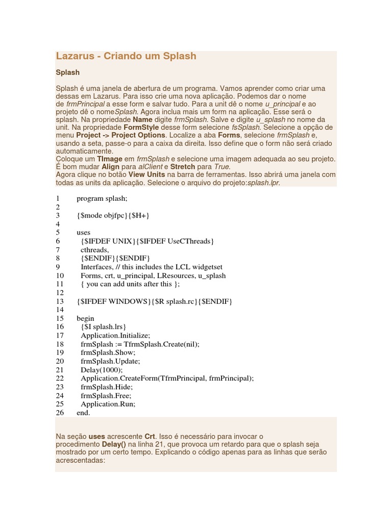 Na seo uses acrescente Crt. Isso necessrio para invocar o procedimento Delay() na linha 21, que provoca um retardo para que o splash seja mostrado por um certo tempo. Explicando o cdigo apenas para as linhas que sero acrescentadas: