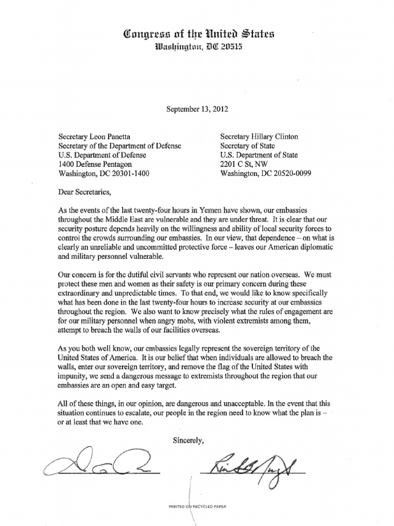 Letter Requesting Information on the Killing of Ambassador Stevens