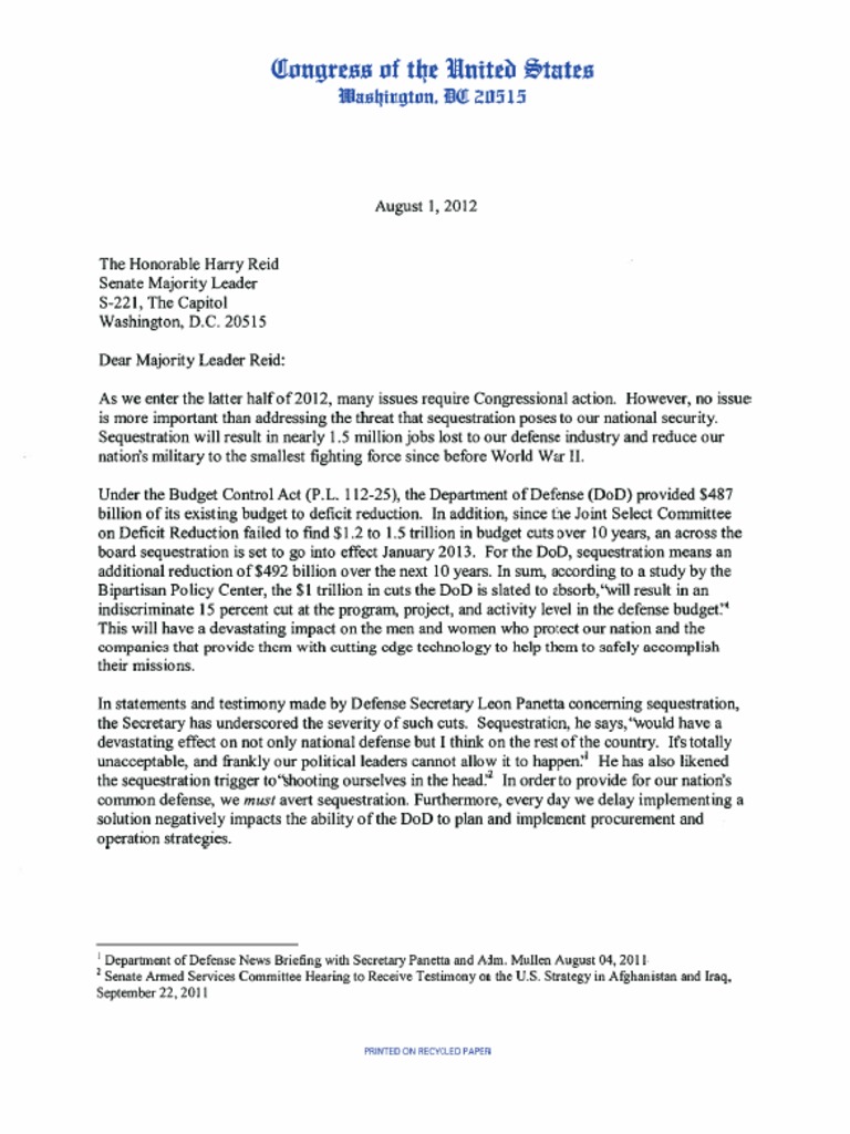August 1, 2012: Rep. Culberson joined 71 members of Congress on letter to Sen. Harry Reid urging the Senate to act on a plan to address defense sequestration.