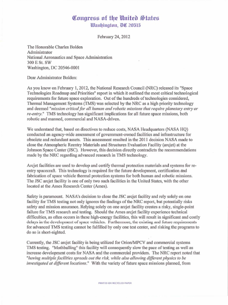 April, 12, 2012: Follow up letter to the February 24, 2012 letter to Administrator Bolden regarding the JSC ArcJet closure requesting a face-to-face meeting.