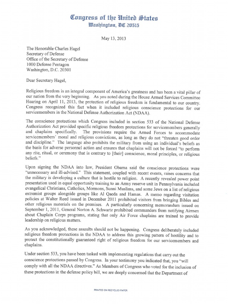 Letter to Secretary Hagel Regarding Religious Freedom in the Military