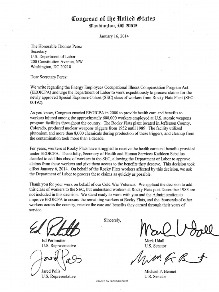 Udall, Bennet, Perlmutter, Polis Letter Pressing Department of Labor to Quickly Aid Rocky Flats Workers