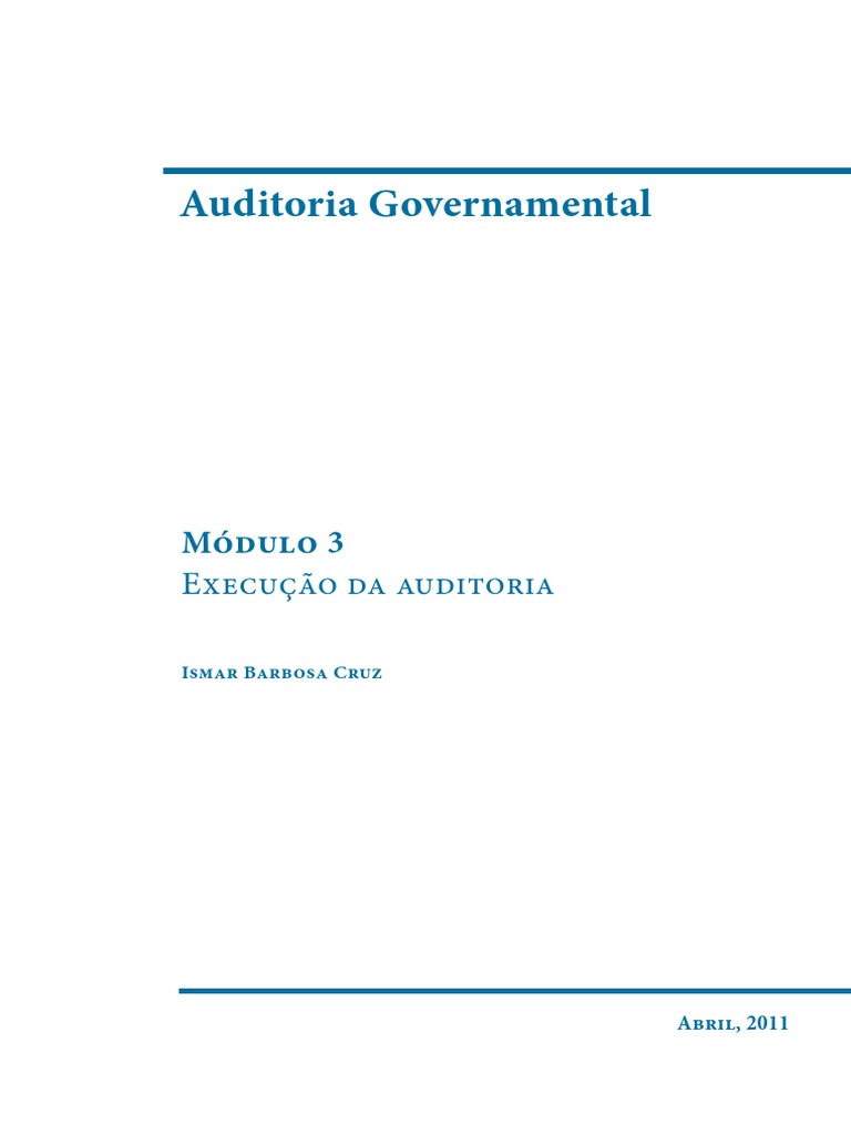Brasil. Tribunal de Contas da Unio. Curso auditoria governamental: mdulo 3 : execuo da auditoria/ Tribunal de Contas da Unio. - 2. ed. Braslia : TCU, Instituto Serzedello Corra, 2011. 20 p. Aula 1: Contextualizao da fase de execuo da auditoria. Conteudista: Ismar Barbosa Cruz. 1.Auditoria, estudo e ensino, Brasil. 2. Auditoria, planejamento. I. Ttulo.
