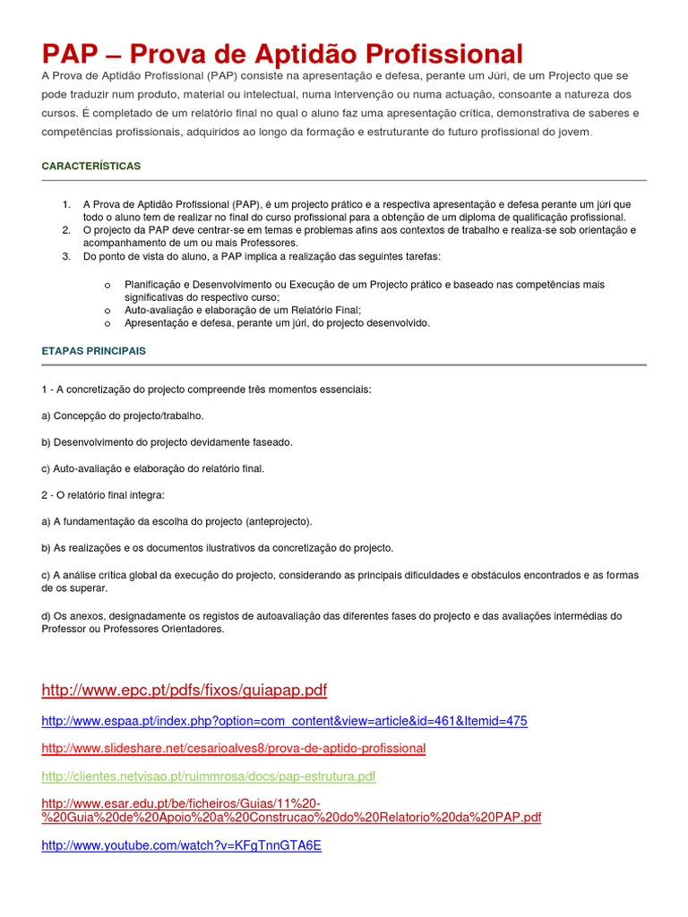 http://www.espaa.pt/index.php?option=com_content&view=article&id=461&Itemid=475 http://www.slideshare.net/cesarioalves8/prova-de-aptido-profissional http://clientes.netvisao.pt/ruimmrosa/docs/pap-estrutura.pdf http://www.esar.edu.pt/be/ficheiros/Guias/11%20%20Guia%20de%20Apoio%20a%20Construcao%20do%20Relatorio%20da%20PAP.pdf http://www.youtube.com/watch?v=KFgTnnGTA6E