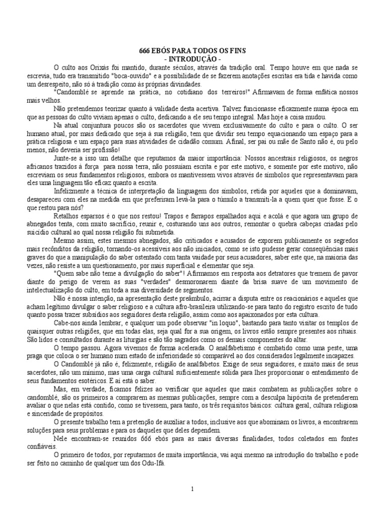 oral. Tempo houve em que nada se escrevia, tudo era transmitido "boca-ouvido" e a possibilidade de se fa erem anota!es escritas era tida e havida como um desrespeito, no s" # tradio como #s pr"prias divindades. "$andombl se aprende na prtica, no cotidiano dos terreiros%" &firmavam de forma enftica nossos mais velhos. 'o pretendemos teori ar quanto # validade desta acertiva. Talve funcionasse efica mente numa poca em que as pessoas do culto viviam apenas o culto, dedicando a ele seu tempo inte(ral. )as ho*e a coisa mudou. 'a atual con*untura poucos so os sacerdotes que vivem exclusivamente do culto e para o culto. O ser humano atual, por mais dedicado que se*a # sua reli(io, tem que dividir seu tempo equacionando um espao para a prtica reli(iosa e um espao para suas atividades de cidado comum. &final, ser pai ou me de +anto no , ou pelo menos, no deveria ser profisso% ,unte-se a isso um detalhe que reputamos da maior import-ncia. 'ossos ancestrais reli(iosos, os ne(ros africanos tra idos # fora para nossa terra, no possu/am escrita e por este motivo, e somente por este motivo, no escreviam os seus fundamentos reli(iosos, embora os mantivessem vivos atravs de s/mbolos que representavam para eles uma lin(ua(em to efica quanto a escrita. 0nfeli mente a tcnica de interpretao da lin(ua(em dos s/mbolos, retida por aqueles que a dominavam, desapareceu com eles na medida em que preferiram lev-la para o t1mulo a transmiti-la a quem quer que fosse. 2 o que restou para n"s3 4etalhos esparsos o que nos restou% Trapos e farrapos espalhados aqui e acol e que a(ora um (rupo de abne(ados tenta, com muito sacrif/cio, reunir e, costurando uns aos outros, remontar o quebra cabeas criadas pelo suic/dio cultural ao qual nossa reli(io foi submetida. )esmo assim, estes mesmos abne(ados, so criticados e acusados de exporem publicamente os se(redos mais rec5nditos da reli(io, tornando-os acess/veis aos no iniciados, como se isto pudesse (erar conseq67ncias mais (raves do que a manipulao do saber ostentado com tanta vaidade por seus acusadores, saber este que, na maioria das ve es, no resiste a um questionamento, por mais superficial e elementar que se*a. "8uem sabe no teme a divul(ao do saber"% &firmamos em resposta aos detratores que tremem de pavor diante do peri(o de verem as suas "verdades" desmoronarem diante da brisa suave de um movimento de intelectuali ao do culto, em toda a sua diversidade de se(mentos. 'o nossa inteno, na apresentao deste pre-mbulo, acirrar a disputa entre os reacionrios e aqueles que acham le(/timo divul(ar o saber reli(ioso e a cultura afro-brasileira utili ando-se para tanto do re(istro escrito de tudo quanto possa tra er subs/dios aos se(uidores desta reli(io, assim como aos apaixonados por esta cultura. $abe-nos ainda lembrar, e qualquer um pode observar "in loquo", bastando para tanto visitar os templos de quaisquer outras reli(i!es, que em todas elas, se*a qual for a sua ori(em, os livros esto sempre presentes aos rituais. +o lidos e consultados durante as litur(ias e so to sa(rados como os demais componentes do altar. O tempo passou. &(ora vivemos de forma acelerada. O analfabetismo combatido como uma peste, uma pra(a que coloca o ser humano num estado de inferioridade s" comparvel ao dos considerados le(almente incapa es. O $andombl * no , feli mente, reli(io de analfabetos. 2xi(e de seus se(uidores, e muito mais de seus sacerdotes, no um m/nimo, mas uma car(a cultural suficientemente s"lida para lhes proporcionar o entendimento de seus fundamentos esotricos. 2 a/ est o saber. )as, em verdade, ficamos feli es ao verificar que aqueles que mais combatem as publica!es sobre o candombl, so os primeiros a comprarem as mesmas publica!es, sempre com a desculpa hip"crita de pretenderem avaliar o que nelas est contido, como se tivessem, para tanto, os tr7s requisitos bsicos. cultura (eral, cultura reli(iosa e sinceridade de prop"sitos. O presente trabalho tem a preteno de auxiliar a todos, inclusive aos que abominam os livros, a encontrarem solu!es para seus problemas e para os daqueles que deles dependem. 'ele encontram-se reunidos 999 eb"s para as mais diversas finalidades, todos coletados em fontes confiveis. O primeiro de todos, por reputarmos de muita import-ncia, vai aqui mesmo na introduo do trabalho e pode ser feito no caminho de qualquer um dos Odu-0f.