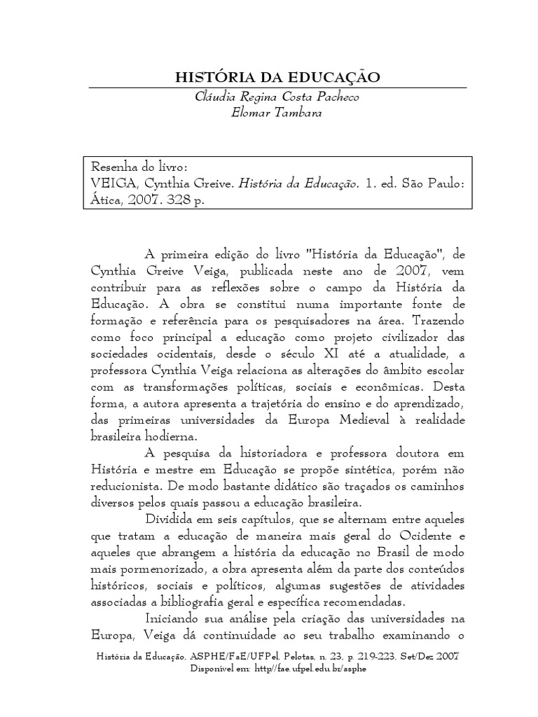 Histria da Educao, ASPHE/FaE/UFPel, Pelotas, n. 23, p. 219-223, Set/Dez 2007 Disponvel em: http//[Link]/asphe