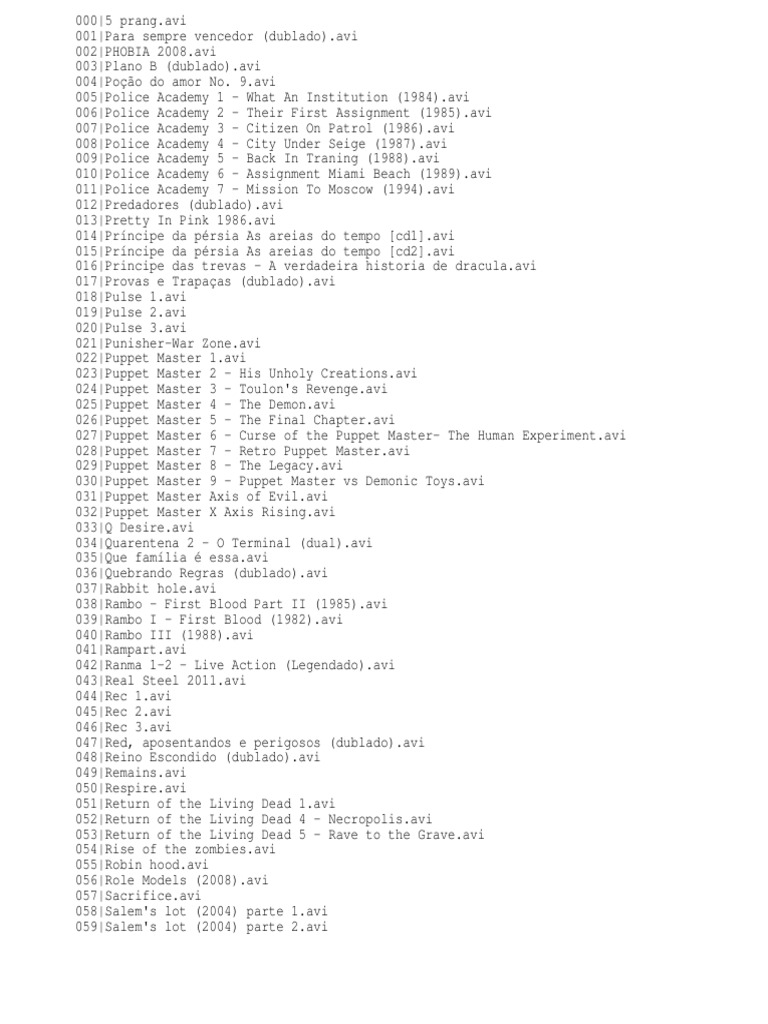 avi 005|Police Academy 1 - What An Institution (1984).avi 006|Police Academy 2 - Their First Assignment (1985).avi 007|Police Academy 3 - Citizen On Patrol (1986).avi 008|Police Academy 4 - City Under Seige (1987).avi 009|Police Academy 5 - Back In Traning (1988).avi 010|Police Academy 6 - Assignment Miami Beach (1989).avi 011|Police Academy 7 - Mission To Moscow (1994).avi 012|Predadores (dublado).avi 013|Pretty In Pink [Link] 014|Prncipe da prsia As areias do tempo [cd1].avi 015|Prncipe da prsia As areias do tempo [cd2].avi 016|Principe das trevas - A verdadeira historia de [Link] 017|Provas e Trapaas (dublado).avi 018|Pulse [Link] 019|Pulse [Link] 020|Pulse [Link] 021|Punisher-War [Link] 022|Puppet Master [Link] 023|Puppet Master 2 - His Unholy [Link] 024|Puppet Master 3 - Toulon's [Link] 025|Puppet Master 4 - The [Link] 026|Puppet Master 5 - The Final [Link] 027|Puppet Master 6 - Curse of the Puppet Master- The Human [Link] 028|Puppet Master 7 - Retro Puppet [Link] 029|Puppet Master 8 - The [Link] 030|Puppet Master 9 - Puppet Master vs Demonic [Link] 031|Puppet Master Axis of [Link] 032|Puppet Master X Axis [Link] 033|Q [Link] 034|Quarentena 2 - O Terminal (dual).avi 035|Que famlia [Link] 036|Quebrando Regras (dublado).avi 037|Rabbit [Link] 038|Rambo - First Blood Part II (1985).avi 039|Rambo I - First Blood (1982).avi 040|Rambo III (1988).avi 041|[Link] 042|Ranma 1-2 - Live Action (Legendado).avi 043|Real Steel [Link] 044|Rec [Link] 045|Rec [Link] 046|Rec [Link] 047|Red, aposentandos e perigosos (dublado).avi 048|Reino Escondido (dublado).avi 049|[Link] 050|[Link] 051|Return of the Living Dead [Link] 052|Return of the Living Dead 4 - [Link] 053|Return of the Living Dead 5 - Rave to the [Link] 054|Rise of the [Link] 055|Robin [Link] 056|Role Models (2008).avi 057|[Link] 058|Salem's lot (2004) parte [Link] 059|Salem's lot (2004) parte [Link]
