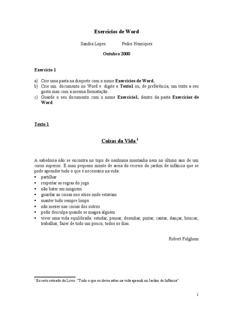 Outubro 2000 Exerccio 1 a) Crie uma pasta na disquete com o nome Exerccios de Word. b) Crie um documento no Word e digite o Texto1 ou, de preferncia, um texto a seu gosto mas com a mesma formatao. c) uarde o seu documento com o nome Exerccio1, dentro da pasta Exerccios de Word.