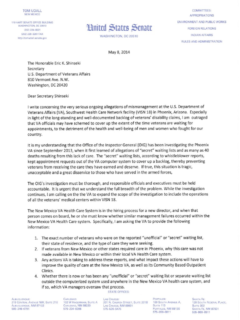 Senator Tom Udall writes a letter to U.S. Department of Veterans Affairs (VA) Secretary Shinseki about ongoing allegations of mismanagement at the Southwest Health Care Network (VISN 18) in …Descrição completa