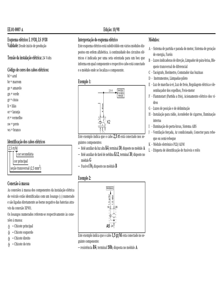 Edio: 10/98 Interpretao do esquema eltrico Este esquema eltrico est subdividido em vrios mdulos dispostos em ordem alfabtica. A continuidade dos circuitos eltricos indicada por uma seta orientada para um box que informa em qual componente o respectivo cabo est conectado e o mdulo onde se localiza o componente. Exemplo 1: Mdulos: A - Sistema de partida e parada do motor, Sistema de gerao de energia, Faris B - Luzes indicadoras de direo, Limpador de pra-brisa, Bloqueio transversal do diferencial C - Tacgrafo, Hormetro, Comutador das buzinas D - Instrumentos, Lmpadas-piloto E - Luz de marcha--r, Luz de freio, Regulagem eltrica e desembaador dos espelhos, Freio-motor F - Flammstart (Partida a frio), Acionamento eltrico dos vidros G - Luzes de posio e de delimitao H - Instalao para rdio, Acendedor de cigarros, Iluminao interna I - Iluminao do porta-luvas, Sistema ABS J - Ventilao forada, Ar condicionado, Conector para reboque ou semi-reboque K - Mdulo eletrnico PLD/ADM L - Etiqueta de identificao de fusveis e rels