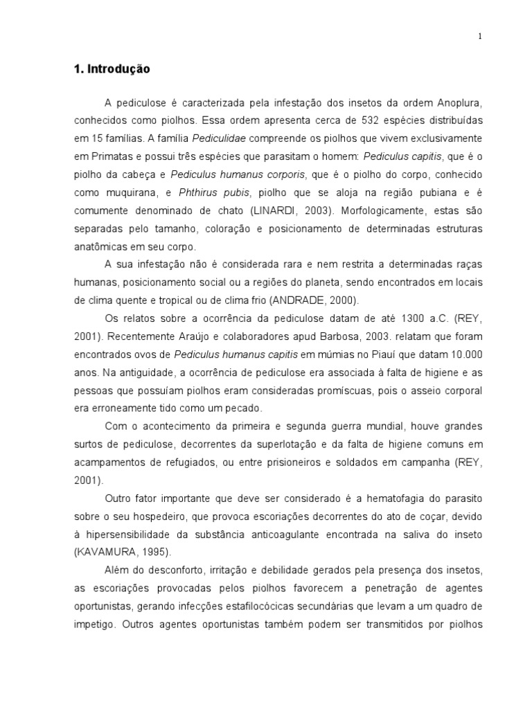 A pediculose é caracterizada pela infestação dos insetos da ordem Anoplura, conhecidos como piolhos. Essa ordem apresenta cerca de 532 espécies distribuídas em 15 famílias. A família Pediculidae compreende os piolhos que vivem exclusivamente em Primatas e possui três espécies que parasitam o homem: Pediculus capitis, que é o piolho da cabeça e Pediculus humanus corporis, que é o piolho do corpo, conhecido como muquirana, e Phthirus pubis, piolho que se aloja na região pubiana e é comumente denominado de chato (LINARDI, 2003). Morfologicamente, estas são separadas pelo tamanho, coloração e posicionamento de determinadas estruturas anatômicas em seu corpo. A sua infestação não é considerada rara e nem restrita a determinadas raças humanas, posicionamento social ou a regiões do planeta, sendo encontrados em locais de clima quente e tropical ou de clima frio (ANDRADE, 2000). Os relatos sobre a ocorrência da pediculose datam de até 1300 a.C. (REY, 2001). Recentemente Araújo e colaboradores apud Barbosa, 2003. relatam que foram encontrados ovos de Pediculus humanus capitis em múmias no Piauí que datam 10.000 anos. Na antiguidade, a ocorrência de pediculose era associada à falta de higiene e as pessoas que possuíam piolhos eram consideradas promíscuas, pois o asseio corporal era erroneamente tido como um pecado. Com o acontecimento da primeira e segunda guerra mundial, houve grandes surtos de pediculose, decorrentes da superlotação e da falta de higiene comuns em acampamentos de refugiados, ou entre prisioneiros e soldados em campanha (REY,