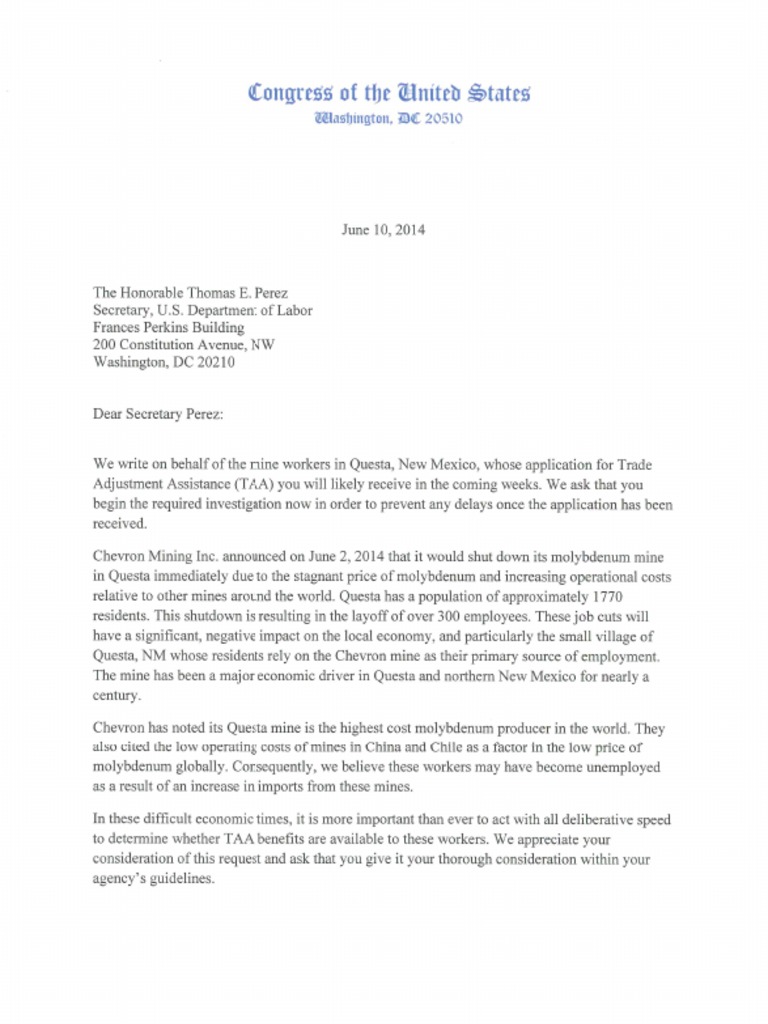Letter to Labor Secretary Perez in favor of TAA for Questa, N.M.