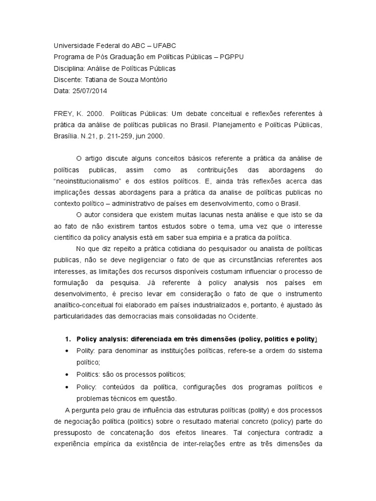 1. Policy analysis: diferenciada em trs dimenses (policy, politics e polityD