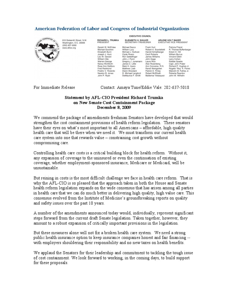 Statement by AFL-CIO President Richard Trumkaon New Senate Cost Containment PackageDecember 8, 2009