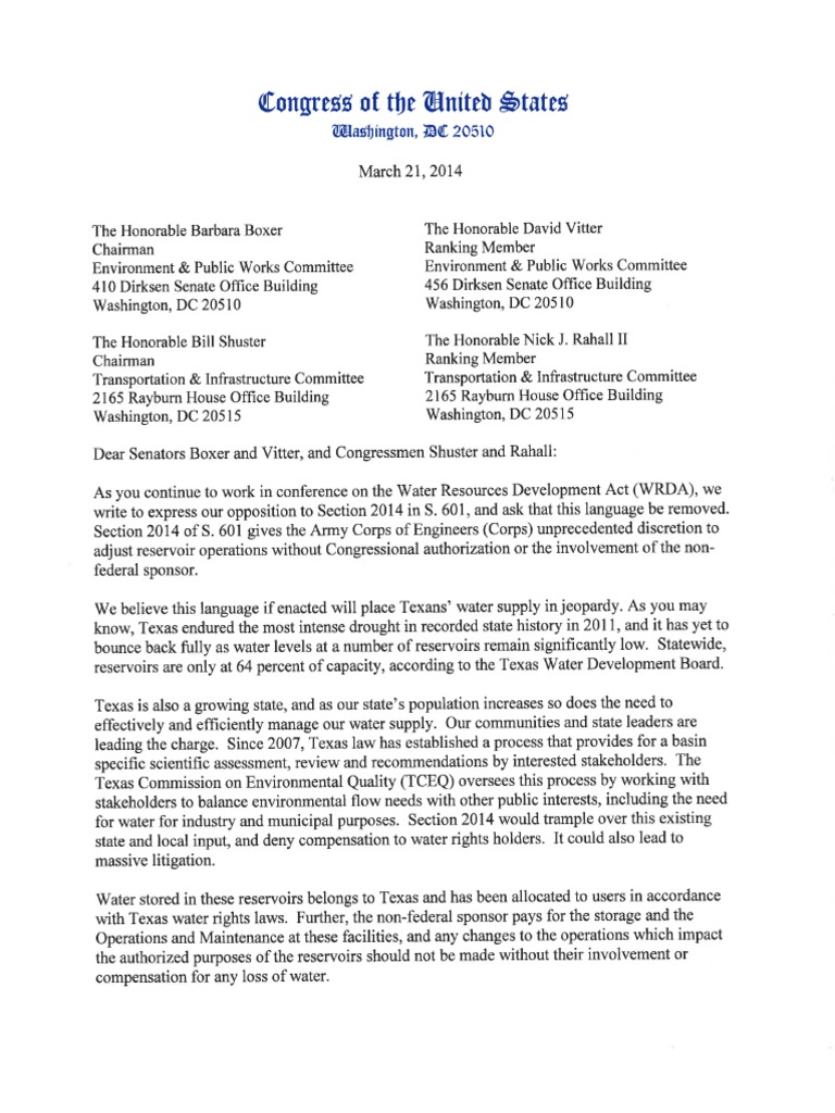 March 21, 2014: Rep. John Culberson joined members of the Texas Congressional delegation in urging the Senate to remove a section of the Water Resources Development Act constraining the Army…Descrição completa